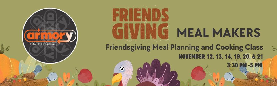 Learn what it takes to plan and prepare Friendsgiving Dinner. Be a part of the cooking team and help present the Friendsgiving meal on November 21st. Develop a plan on what to cook and learn how to prepare the turkey, set the table, and more.